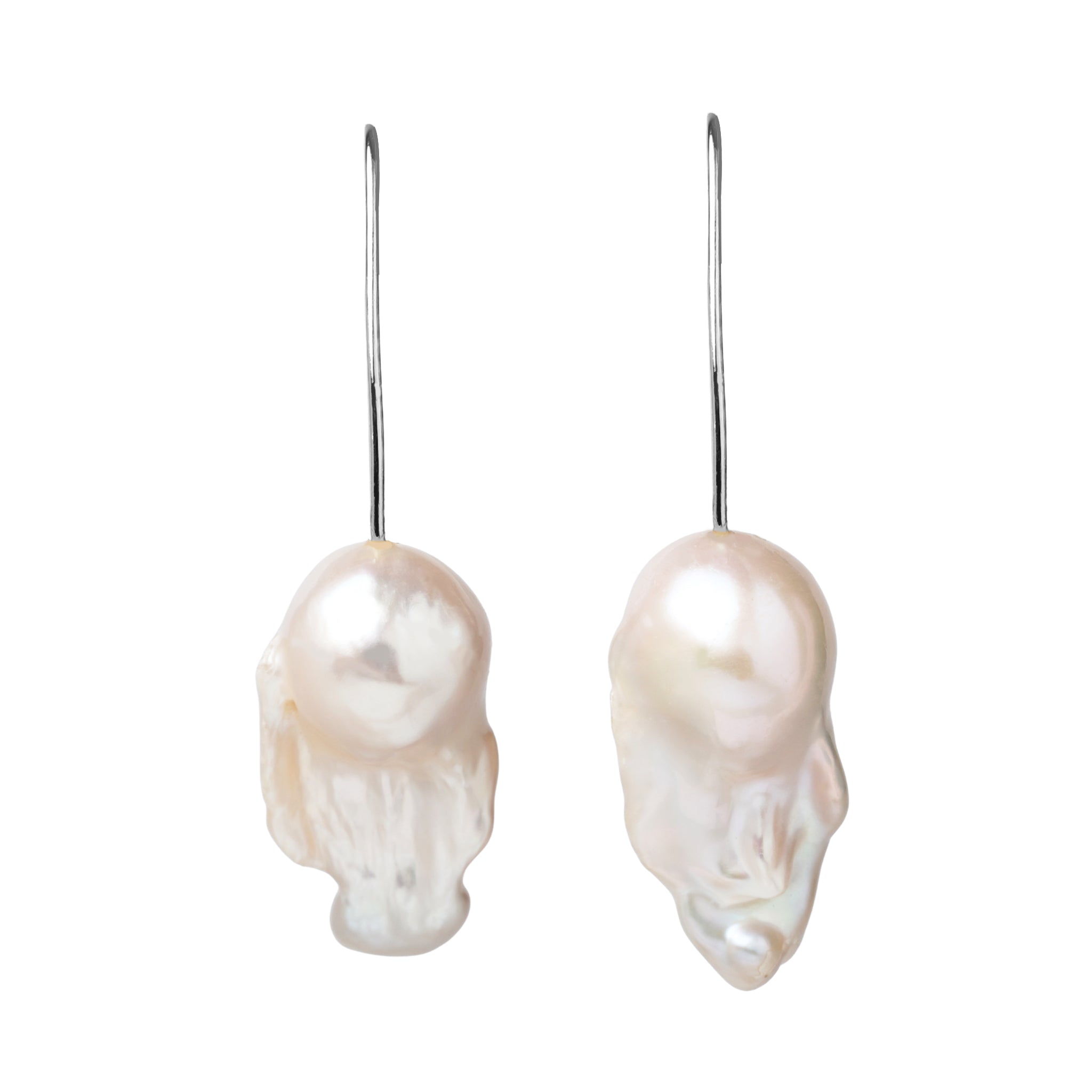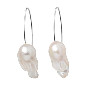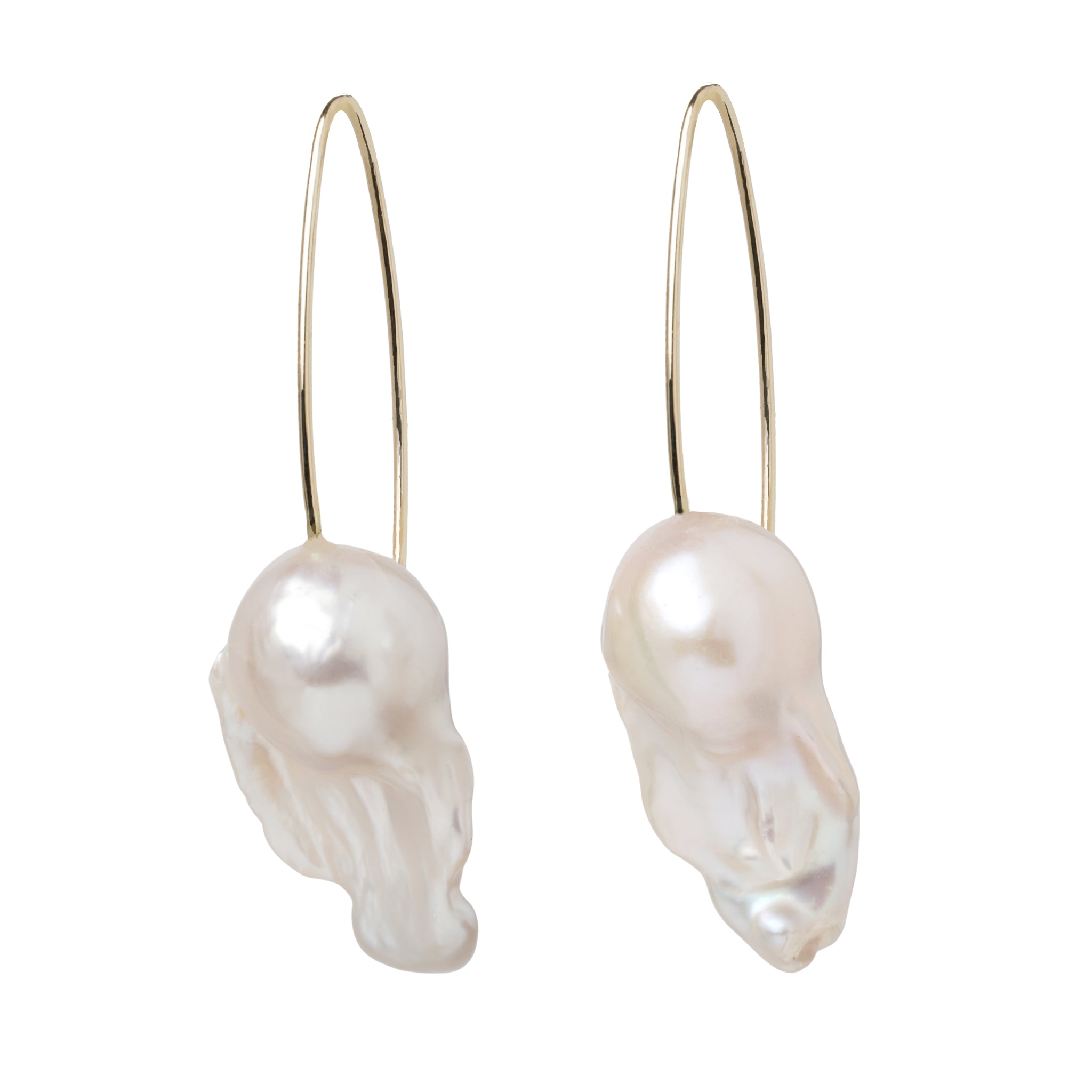 A striking expression of scale and fluid form. These extra-large baroque pearl drop earrings feature luminous, organically formed pearls suspended from a solid gold elongated curved wire, designed to create elegant movement and bold visual impact.