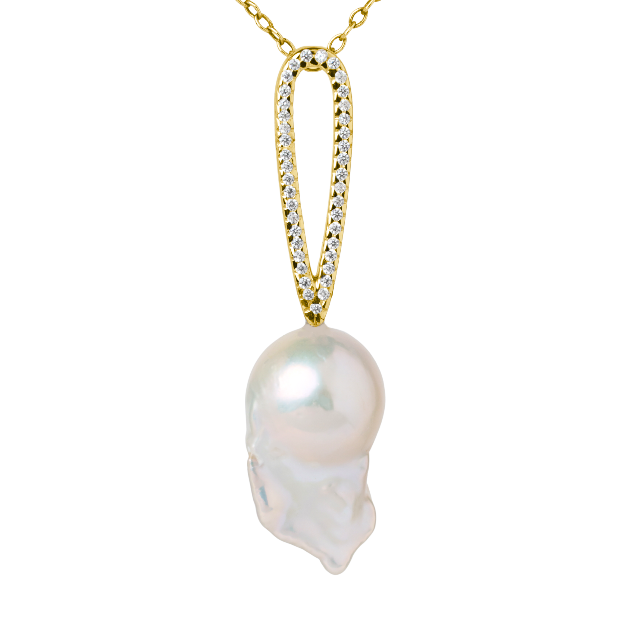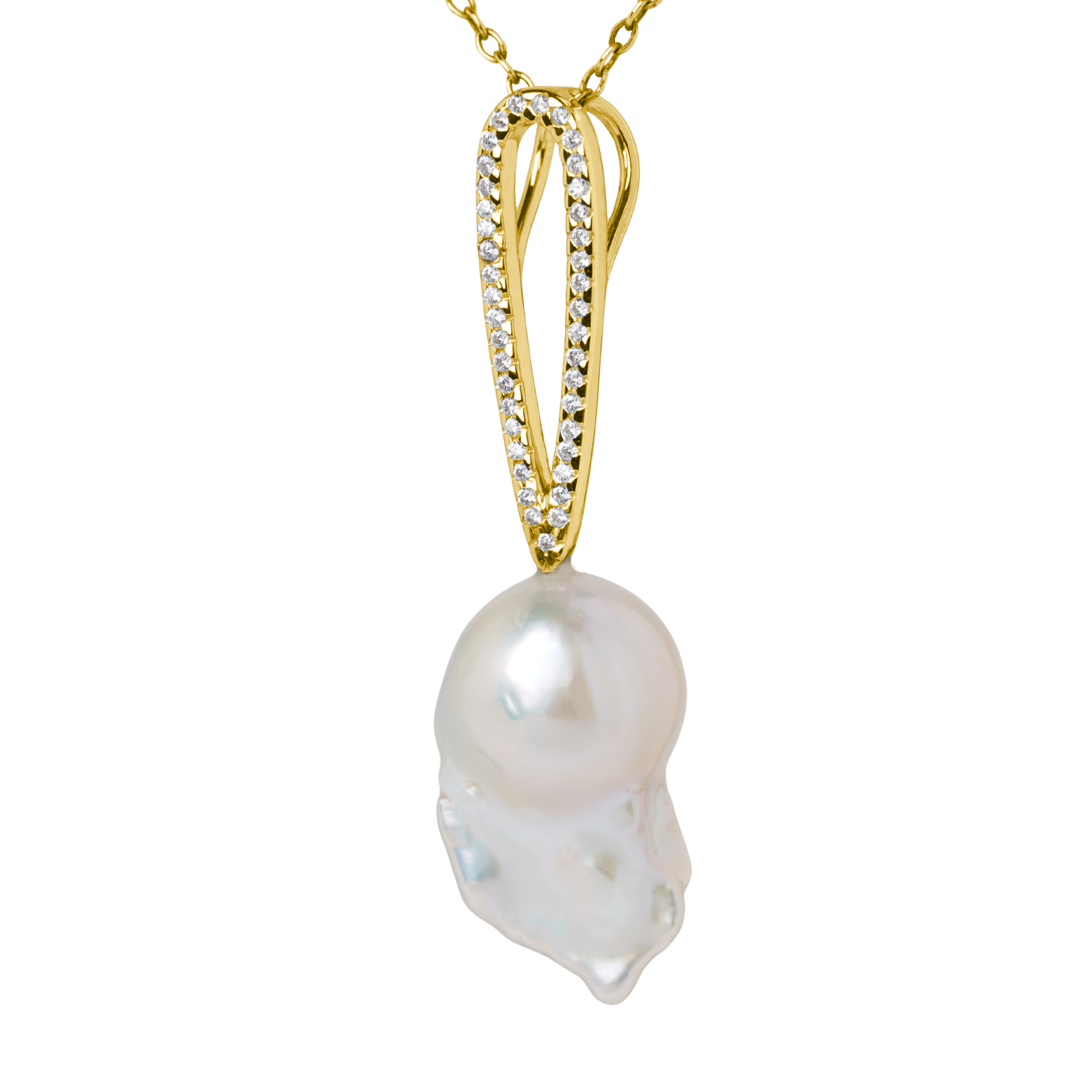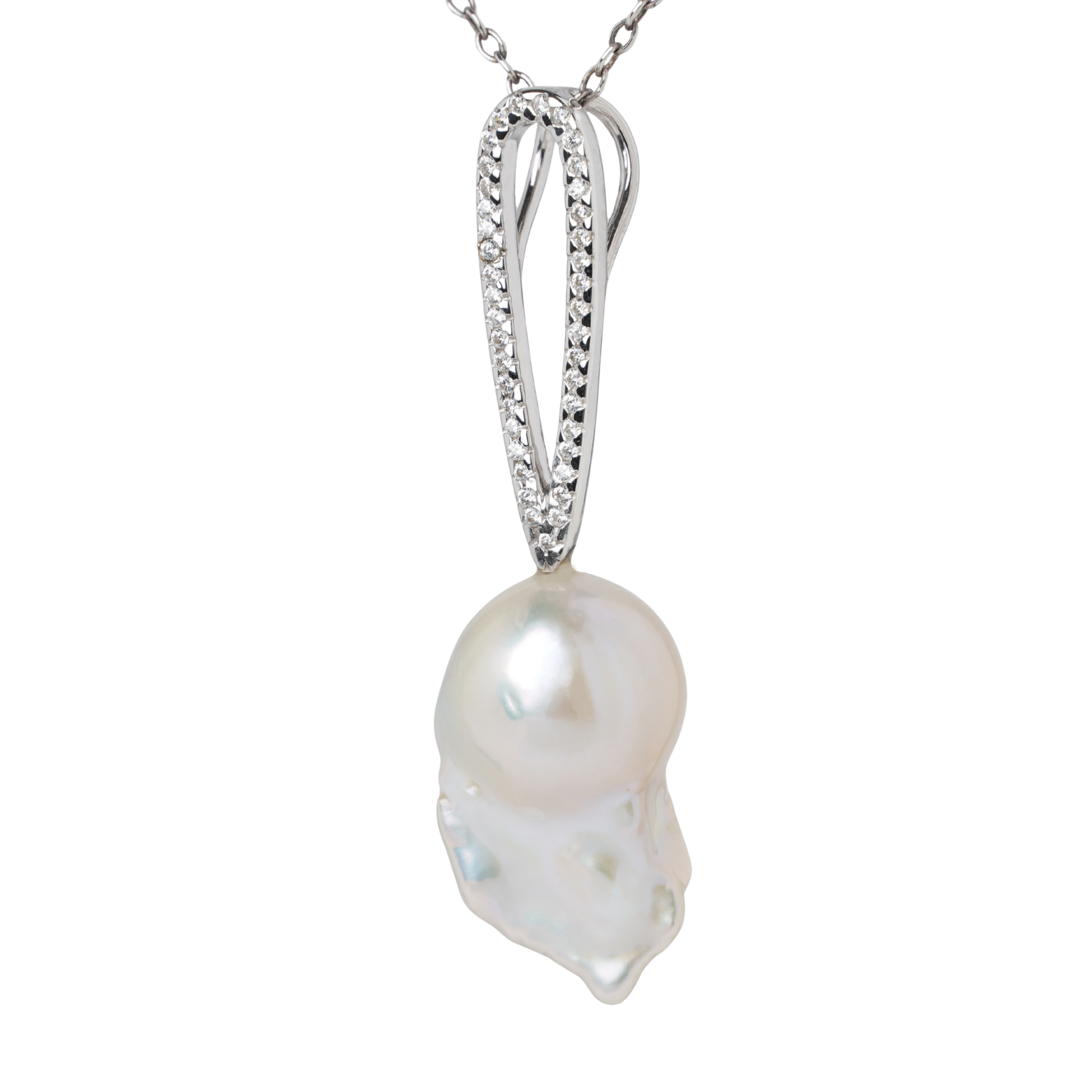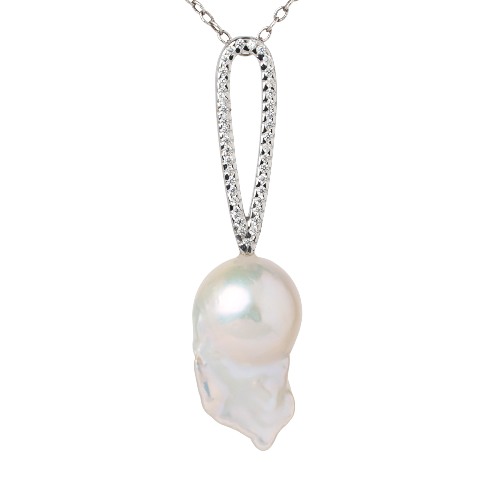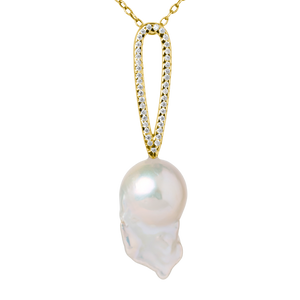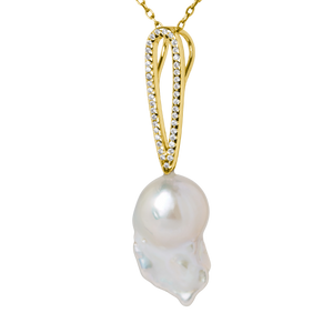 A refined balance of light and form. This diamond-set teardrop pendant is crafted to frame a luminous baroque pearl, creating a fluid composition of brilliance and organic beauty. Natural diamonds trace the soft teardrop silhouette, drawing the eye to the pearl suspended below.
